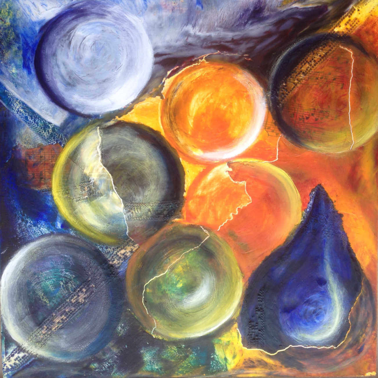 zzgl. VersandkostenCold wax Mixed-Media auf Gesso Board – Mit Hilfe von Collage, Stoffprägung und vielen Cold wax Schichten mit Ölfarbe, ist ein buntes Bild mit Tiefgang entstanden.
