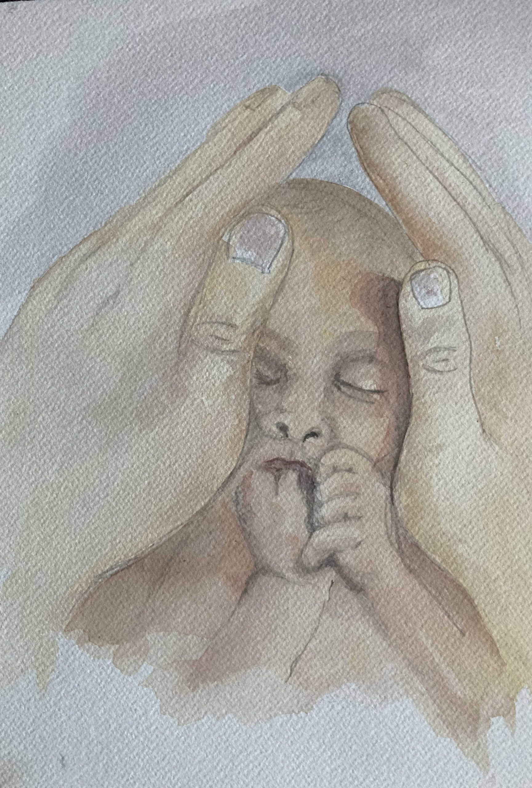 Sicher in den Händen des Vaters – Aquarell auf Papier. Dieses Bild steht für Geborgenheit und Sicherheit, für die Verantwortung von Eltern, ihre Kinder zu schützen und zu versorgen aber auch für die Liebe des himmlischen Vaters.