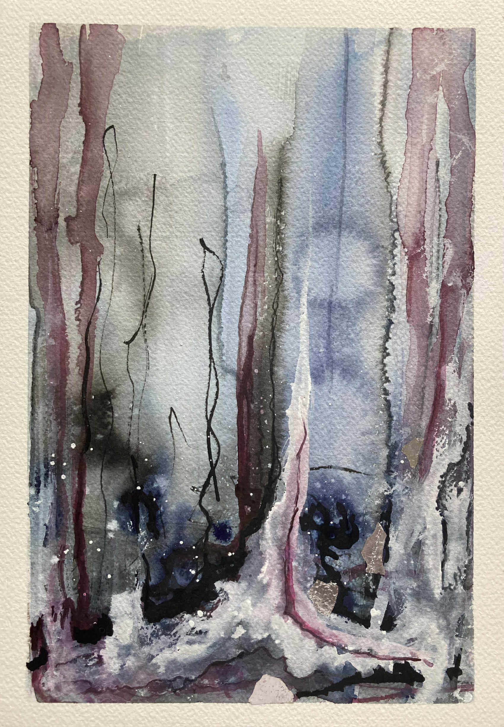 Aquarell Mixed-Media auf Papier – Das Bild zeigt die Faszination der kalten Farben, die Kraft in den Kontrasten und die Lebendigkeit, die auch in der Kälte der Natur zu finden ist.