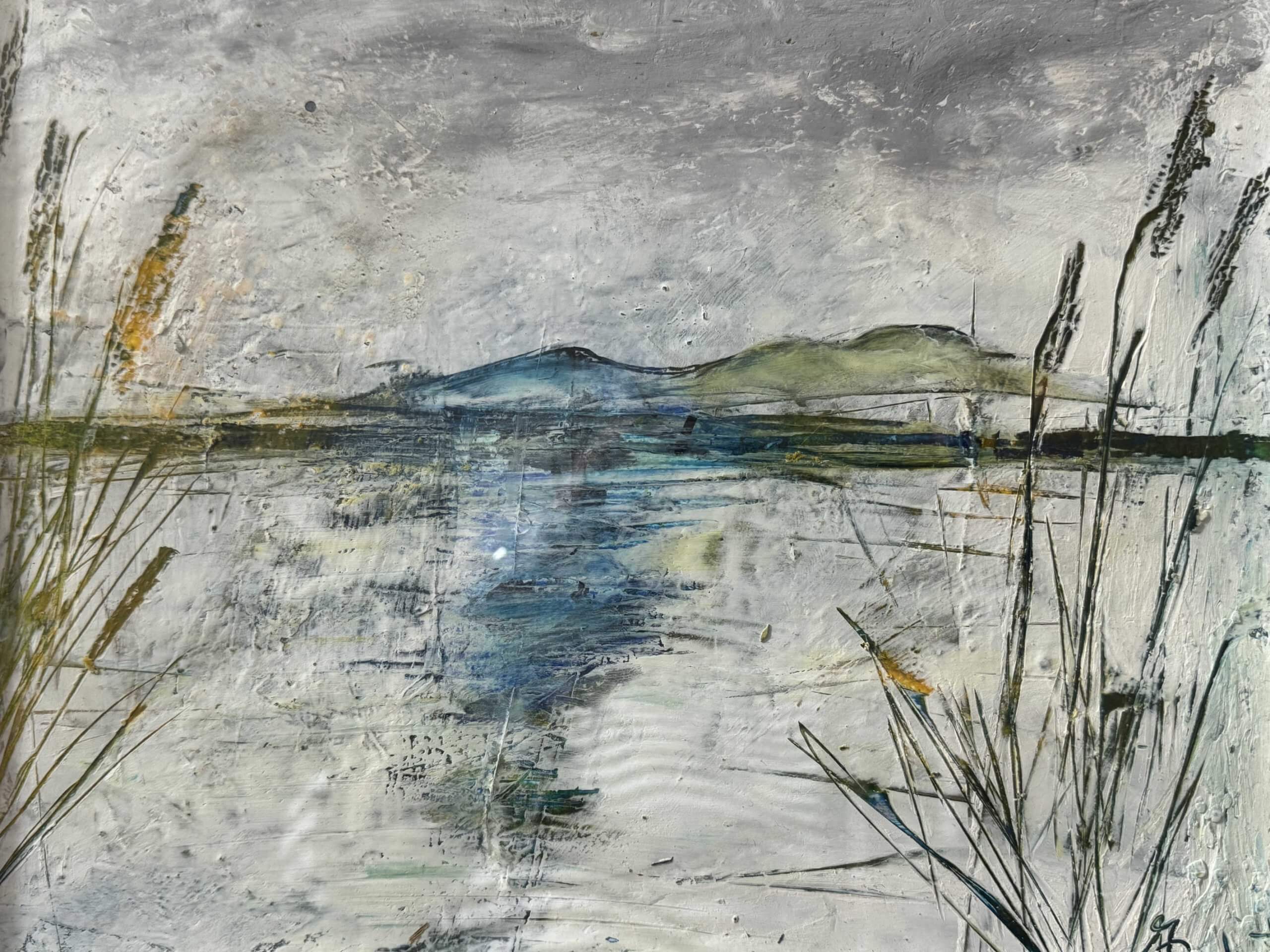 Cold wax Mixed-Media auf Papier – Dieses Bild strahlt die Ruhe mitten in der Natur, an einem See aus.